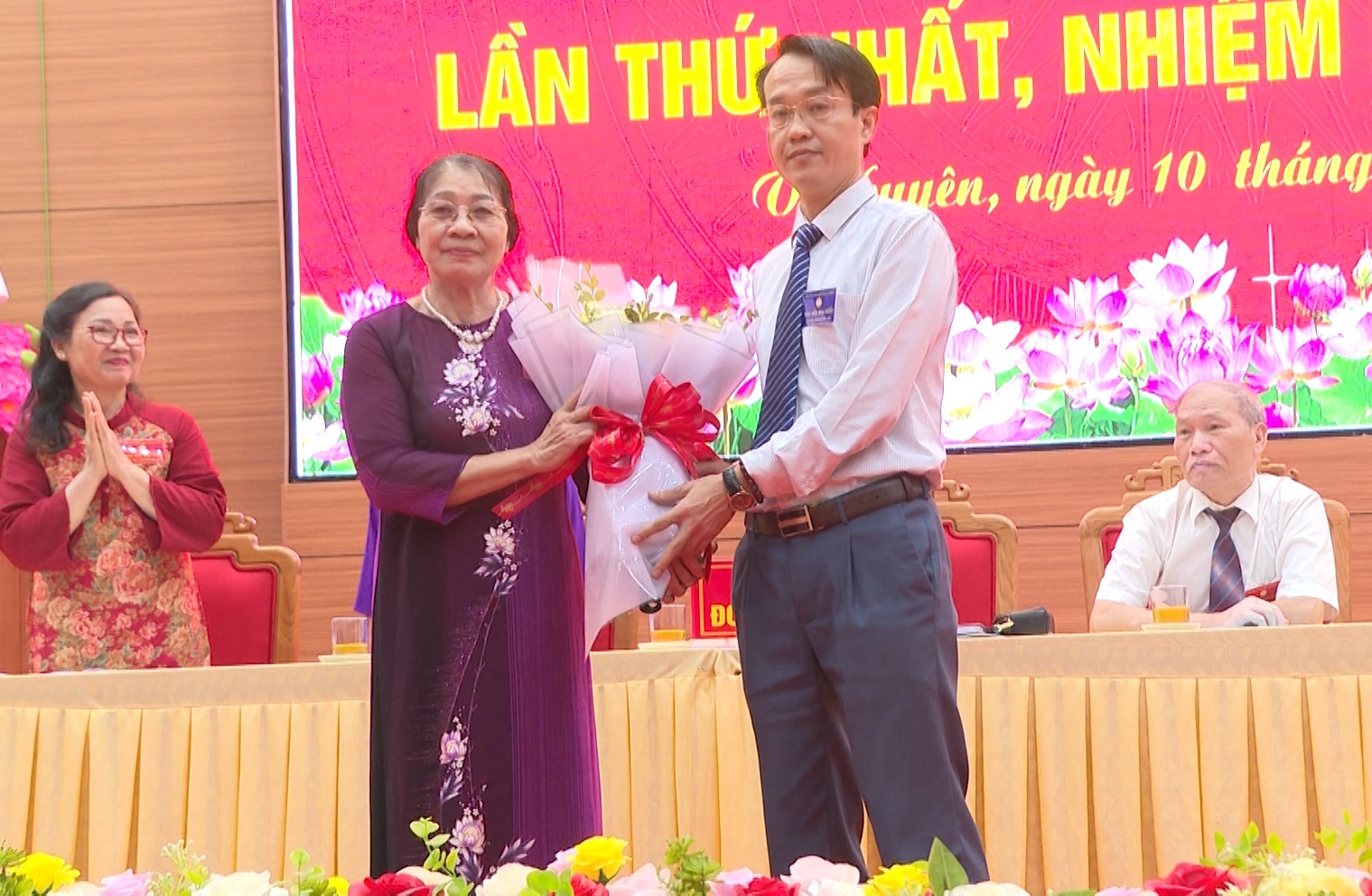 Phó Chủ tịch UBND xã Lý Xuân Tiến tặng hoa chúc mừng Đại hội