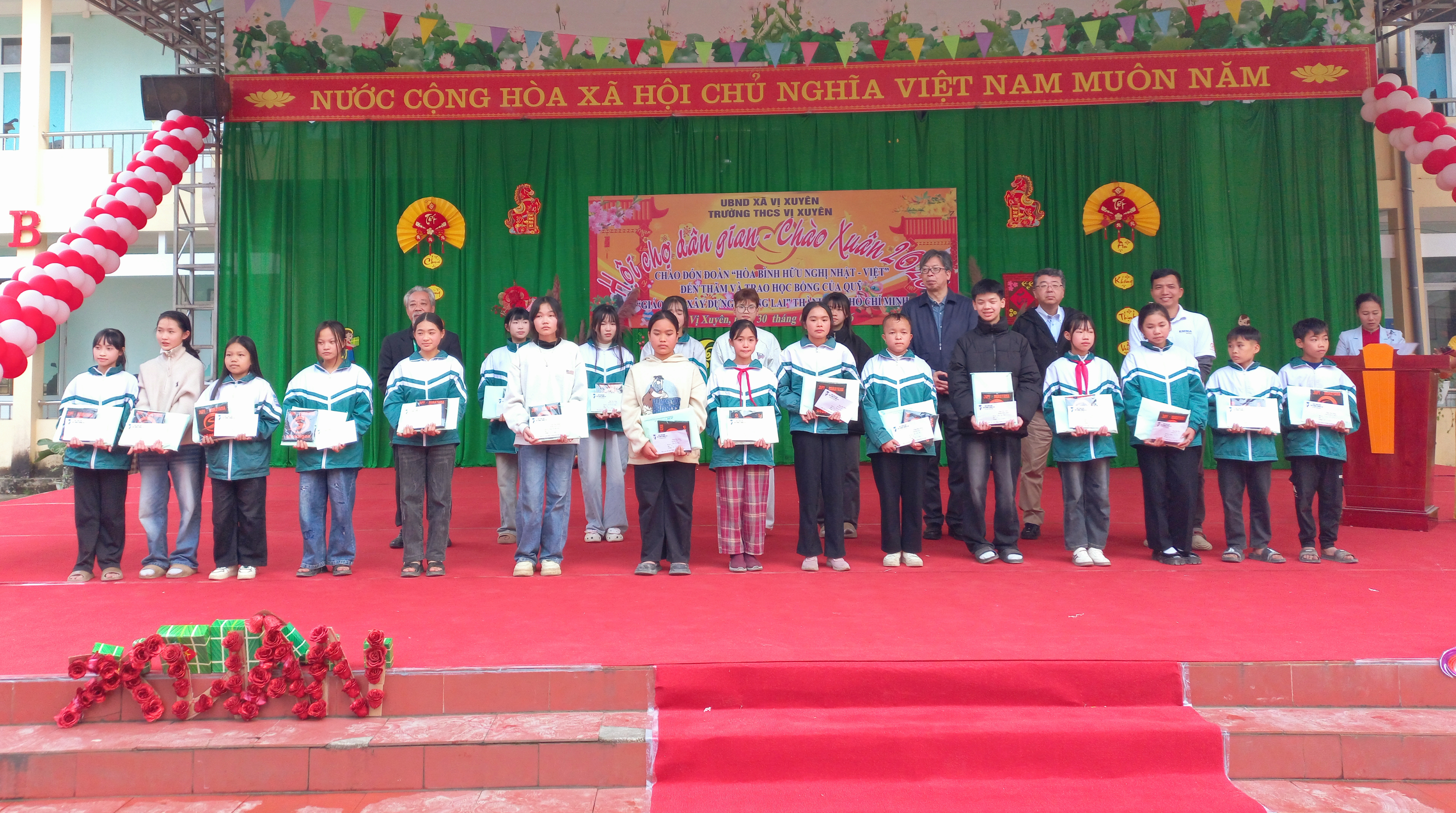 Đoàn Hội đồng Hòa bình hữu nghị Nhật - Việt đã trao 10 suất học bổng cho 10 em học sinh trường PTDT NT THCS & THPT, trao 20 suất học bổng cho 20 em học sinh trường THCS Vị Xuyên, mỗi suất học bổng 4 triệu đồng. Đây là năm thứ 10 và cũng là lần cuối cùng Đoàn Hội đồng Hòa bình hữu nghị Nhật - Việt trao học bổng tại 2 trường, khép lại hành trình đầy ý nghĩa của tình hữu nghị, hòa bình và tinh thần nhân ái cao đẹp giữa nhân dân Nhật Bản và nhân dân Việt Nam. Những xuất học bổng không chỉ là món quà vật chất, mà còn là nguồn động viên tinh thần có ý nghĩa vô cùng to lớn đối với các em học sinh, giúp các em thêm tự tin, nghị lực để vươn lên trong học tập và cuộc sống