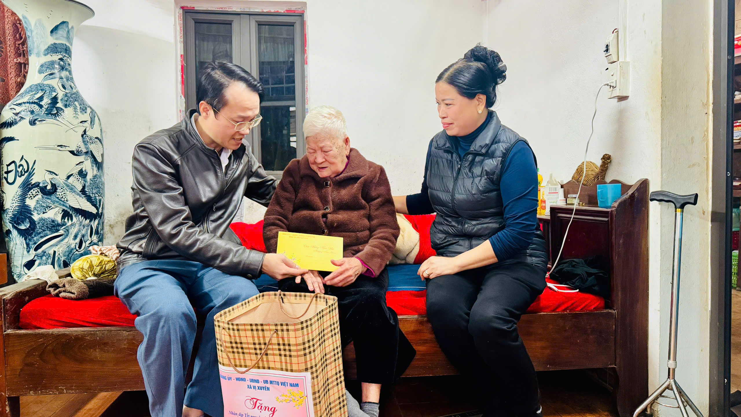 Đồng chí Phó chủ tịch Thường trực UBND xã đã đến thăm và tặng quà của Tỉnh ủy – HĐND- UBND- UBMTTQ tỉnh và Đảng ủy – HĐND – UBND - UBMTTQ xã Vị Xuyên cho người cao tuổi Bà Phạm Thị Cúc 103 tuổi, thôn 4; Bà Trịnh Thị Bông 107 tuổi thôn 15; Bà Lê Thị Hội 103 tuổi, thôn Hợp Thành; Bà Nguyễn Thị Nhừ, 101 tuổi , thôn Độc Lập; Bà Chu Thị Pèng, 82 tuổi, thôn Làng Má; Ông Vương Văn Thàng Thương binh, Thôn Bình Vàng. Cháu Hoàng Thị Diễn đối tượng bảo trợ xã hội, thôn Bình Vàng.