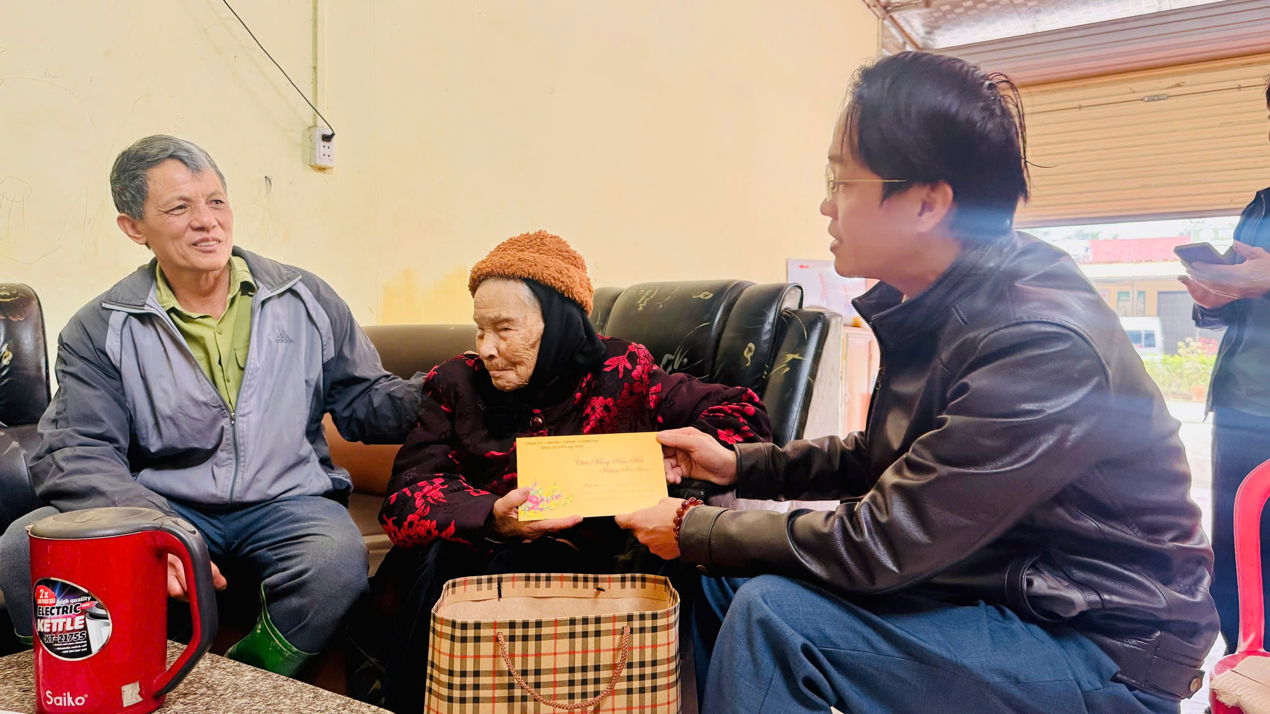 Phó chủ tịch Thường trực UBND xã Lý Xuân Tiến trao quà Bà Lê Thị Hội 103 tuổi, thôn Hợp Thành