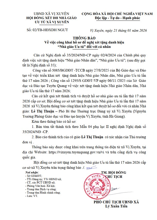Thông báo Về việc công khai hồ sơ đề nghị xét tặng danh hiệu "Nhà giáo Ưu tú" đối với cá nhân